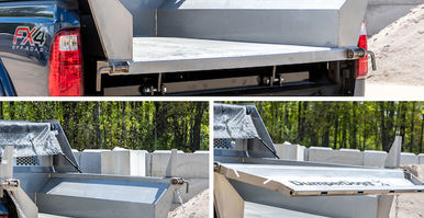 The multi-purpose DumperDogg Stainless Steel Dump Insert has a double pivoting and removable tailgate. Four 3/4 in. quick release hinge pins allow the tailgate to open up or down for loading or unloading. They can also be removed completely for easy access to the truck bed. These features enable you to continue to use your truck for transporting standard items, accommodating plywood sheets and pallets. A powder-coated steel structural frame maintains the integrity of the DumperDogg Stainless Steel Dump Insert for years of use.